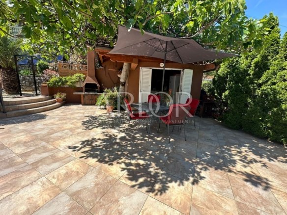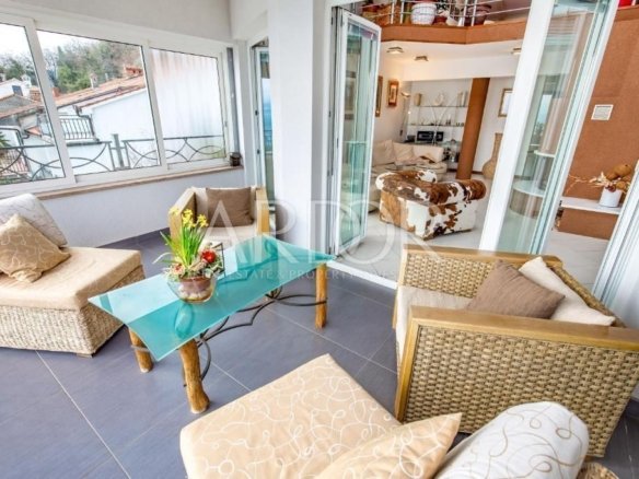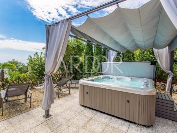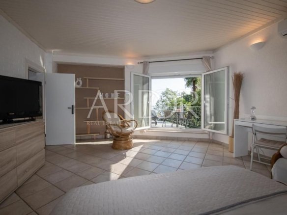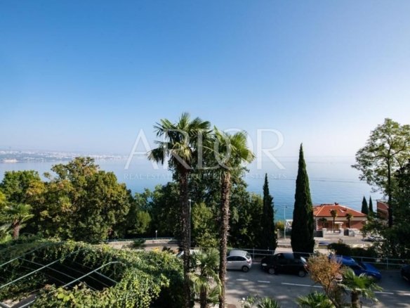 Opatija, lepo urejena in vzdrževana hiša z apartmaji za prodajo, dobro vzdrževana za najem. Hiša ima 4 stanovanjske enote, popolnoma opremljene, teraso s prostorom za sončenje in jacuzzijem ter letno kuhinjo. Nahaja se na mirni lokaciji z očarljivim pogledom na morje, s skupno bivalno površino 482 m2 v treh etažah. V pritličju: enosobno stanovanje 1F+DB 67 m2, ki obsega dva hodnika, dnevno sobo, kuhinjo, spalnico, dve kopalnici, ložo in nepokrito teraso, dve shrambi, skupaj 97 m2. V prvem nadstropju: stanovanje 118 m2, 4 spalnice, obsega hodnik, dnevna soba, kuhinja, tri spalnice, garderoba, tri kopalnice, dve loži, nepokrita terasa, tri shrambe, skupaj 140 m2. V prvem nadstropju: apartma 23 m2, dnevna soba s kuhinjo, ena spalnica, kopalnica. V drugem nadstropju: stanovanje 135 m2 z galerijo, dve nepokriti terasi, dve loži, balkon, velika dnevna soba s kaminom, kuhinja in jedilnica, dve spalnici, garderobna soba, dve kopalnici, WC, notranje stopnišče, ki vodi na galerijo s spalnico in kopalnico, skupna površina stanovanja 222 m2. Dvorišče je v celoti urejeno, kultivirano z mediteranskimi rastlinami, z gospodarskim poslopjem, ki služi kot letna kuhinja, zunanji kamin/žar, terasa za sončenje, masažna kad. Pridobljeno je bilo gradbeno dovoljenje za vgradnjo dvigala in izgradnjo garaže in stanovanja 30 m2.