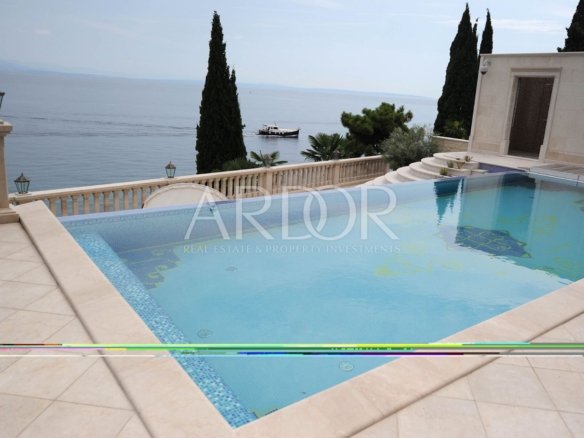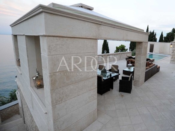 Das Gebäude, das von der Straßenseite als Familienbesitz fungiert, erhält seine wahre Bedeutung vom Meer aus. Der Parkplatz und die Garage befinden sich auf der gleichen Ebene wie das oberste Stockwerk, die Opulenz erstreckt sich nach unten, und schließlich gibt es auch einen kaskadenartigen Abstieg bis zum Meer. Vier Stockwerke, eine großzügige Terrasse mit Swimmingpool und Liegewiese, alles umrahmt von monumentalen, mit Brac-Stein belegten Steintreppen, die nachts durch die stimmungsvolle Beleuchtung besonders eindrucksvoll wirken, bis hin zum Privatstrand.