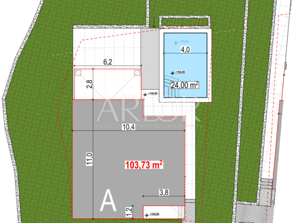 Građevinsko zemljište veličine 561,47 m2 sa predanom dokumentacijom za ishodovanje građevinske dozvole. Vila A iz projekta ima vlastiti privatni bazen, vanjsku natkrivenu terasu, vrt, parkirališta i podrum. Na prizemlju, velikom 102,62 m2 nalaze se kuhinja, dnevni boravak i jedna spavaća soba s kupaonicom, dok na katu veličine 70,30 m2 nalaze se tri sobe, te dvije kupaonice.
