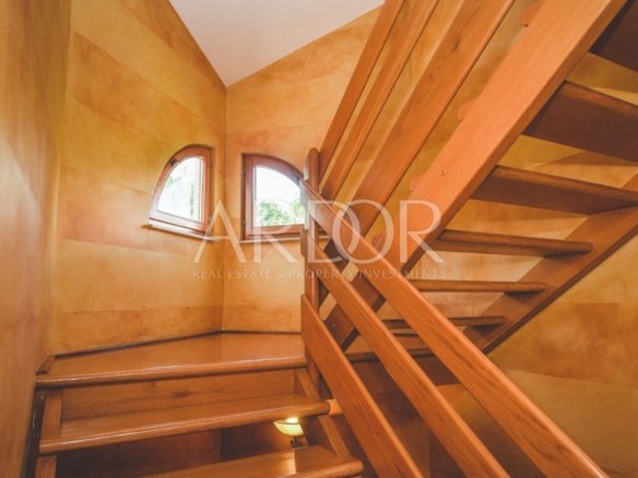 The ground floor consists of an entrance hall, toilet, kitchen, large living room with terrace and green lawn. An internal staircase leads to the first floor where there is an entrance hall, bathroom with toilet, one bedroom and a kitchen with living room and terrace. The second floor consists of a hallway, bathroom with toilet, balcony and three bedrooms, two of which have access to their own loggias, and one balcony with a beautiful panoramic view. On the property there is an auxiliary building of 20 m2 which can serve as a storage room or garden house. All floors are fully furnished. Heating and cooling with air conditioners and electric radiators.