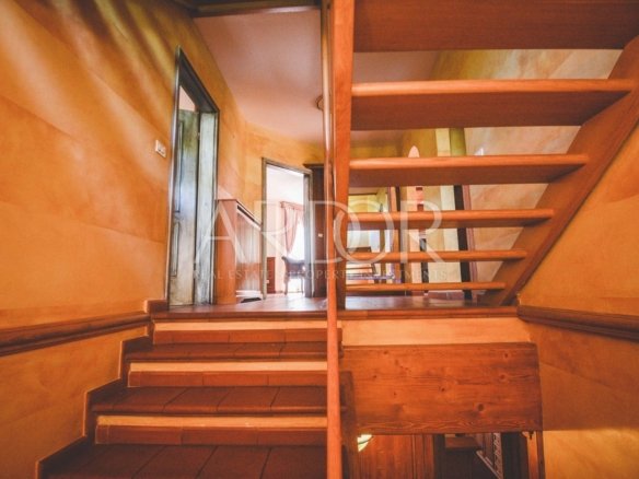 Il piano terra è composto da ingresso, wc, cucina abitabile, ampio soggiorno con terrazzo e prato verde. Una scala interna conduce al primo piano dove si trova un ingresso, bagno con wc, una camera da letto e una cucina con soggiorno e terrazzo. Il secondo piano è composto da un disimpegno, bagno con wc, balcone e tre camere da letto, di cui due con accesso alle proprie logge, e un balcone con bella vista panoramica. Sulla proprietà c’è un edificio ausiliario di 20 m2 che può fungere da ripostiglio o casetta da giardino. Tutti i piani sono completamente arredati. Riscaldamento e raffrescamento con condizionatori e radiatori elettrici.