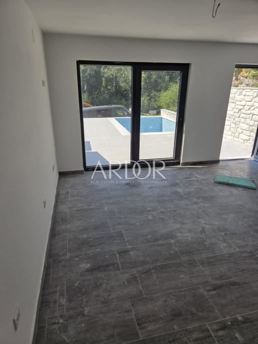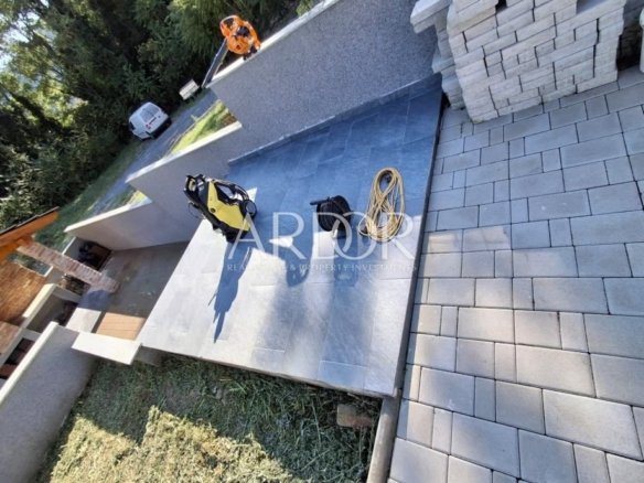 Prizemlje – Sastoji se od otvorenog dnevnog prostora s kuhinjom i blagovaonicom, dnevnim boravkom, gostinjskog WC-a te izlaza na prostranu natkrivenu terasu od 20 m² koja vodi do bazena, stvarajući savršen spoj unutarnjeg i vanjskog prostora za uživanje tijekom ljeta.