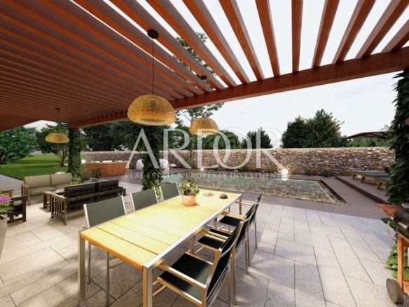 Vanjski prostori kuće jednako su impresivni, s nekoliko natkrivenih i nenatkrivenih terasa koje pružaju dovoljno prostora za objedovanje na otvorenom, odmaranje i upijanje sunca. Središnji dio vanjskog prostora je predviđen za bazen od 50 m2. Vrt je pažljivo njegovan i krasi ga mnoštvo mediteranskih biljaka i drveća, stvarajući skladan spoj prirode i arhitekture.