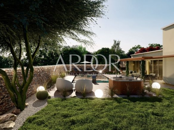 The exterior spaces of the house are equally impressive, with several covered and uncovered terraces that provide ample space for al fresco dining, relaxing and soaking up the sun. The central part of the outdoor area is designed for a 50 m2 swimming pool. The garden is carefully tended and adorned with a multitude of Mediterranean plants and trees, creating a harmonious blend of nature and architecture.