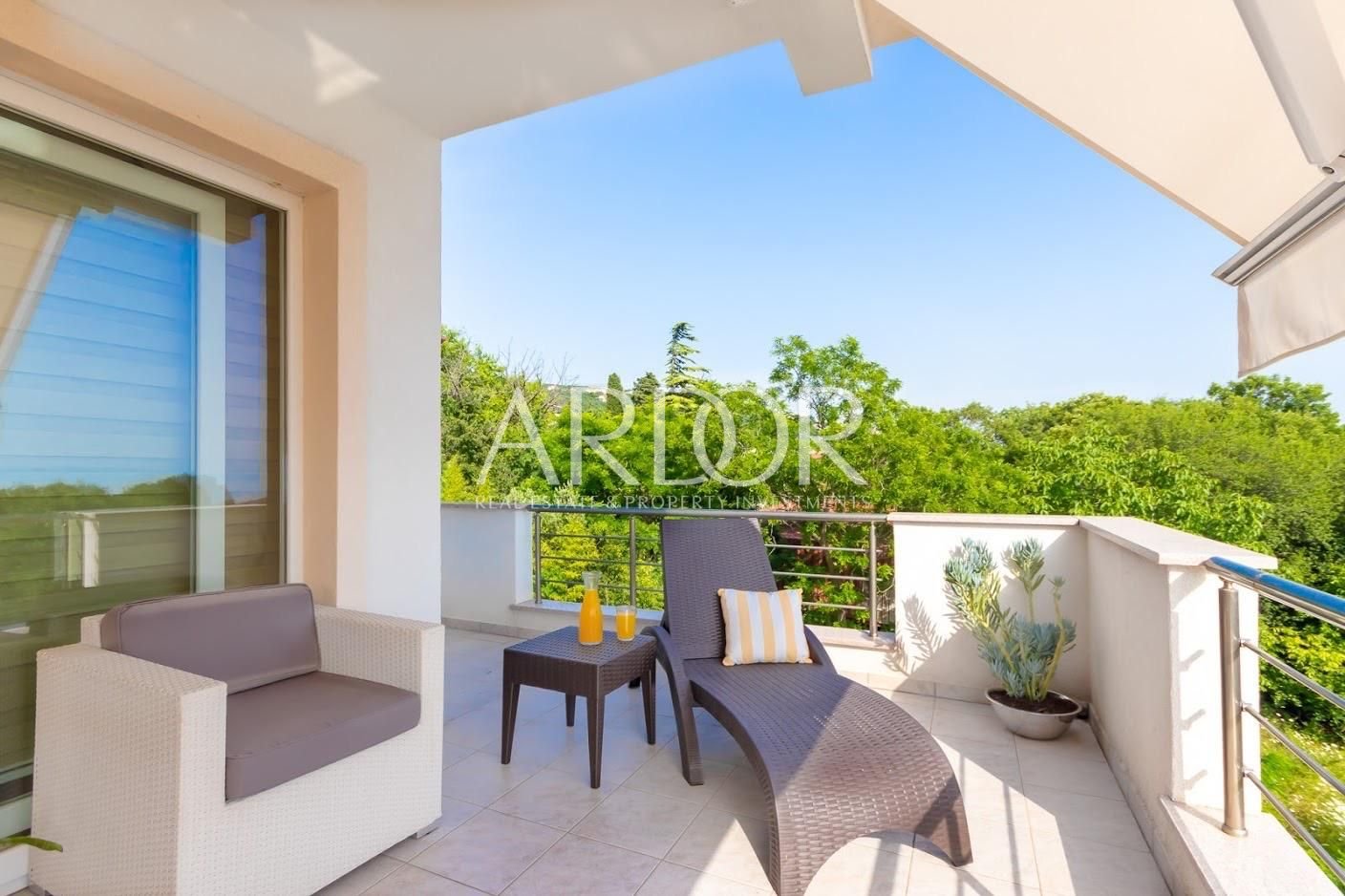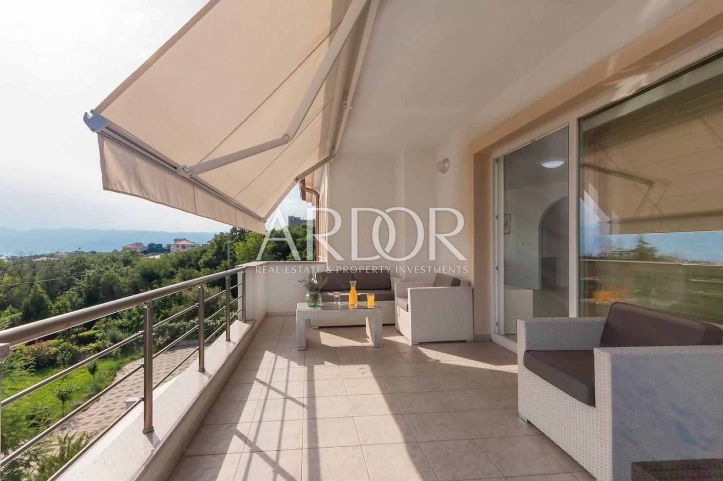 U mirnom dijelu Kostrene, na prvom katu uredno održavane obiteljske kuće s uređenim vrtom, video nadzorom i električnom kapijom, smješten je stan koji nudi ugodan spoj funkcionalnog rasporeda i mediteranskog okruženja. Stan se odlikuje privatnošću i sigurnošću, uz otvoren pogled prema moru i južnu orijentaciju.