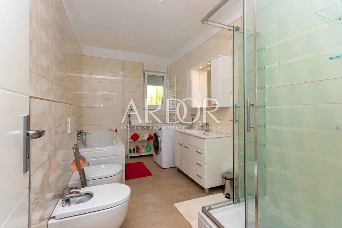 Uz glavnu kupaonicu s kadom i tuš kabinom, stan ima i odvojeni WC. Dodatna prostorija predviđena je kao garderoba ili pomoćni prostor te uključuje ostavu i dio za kućanske potrebe, što dodatno doprinosi praktičnosti i organizaciji stana.