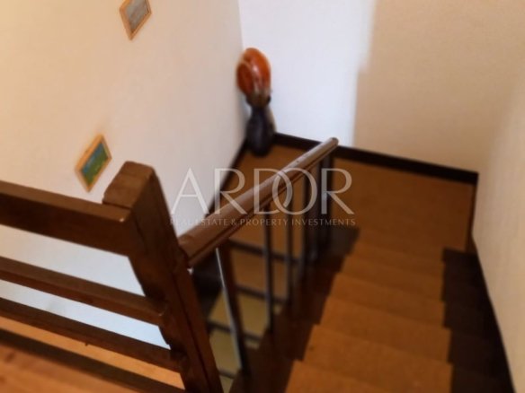 on the ground floor there is a three bedroom apartment, in front of which is a huge terrace, barbecue, garage and garden house. Upstairs are three bedrooms with bathrooms and private