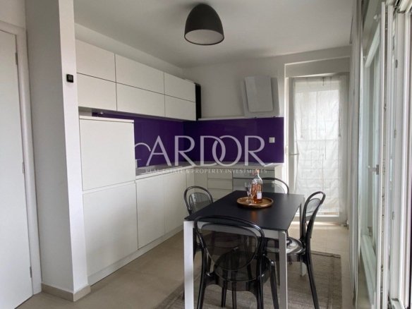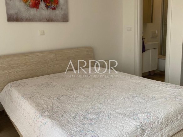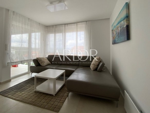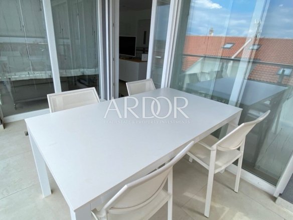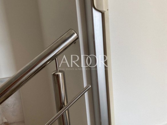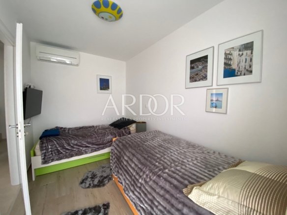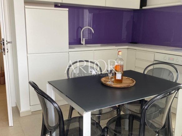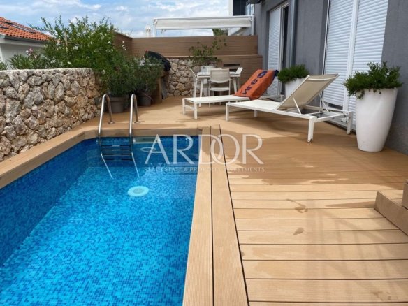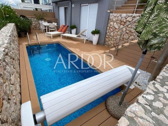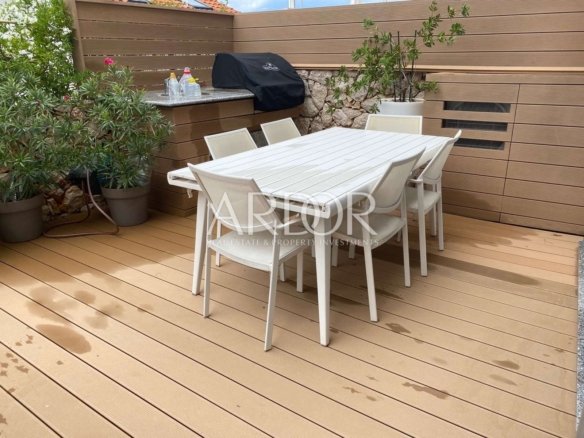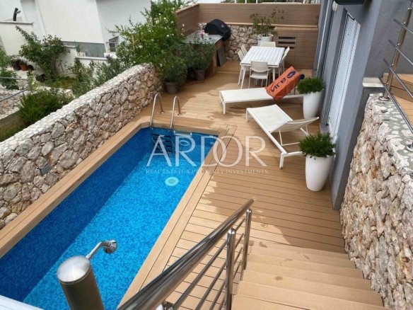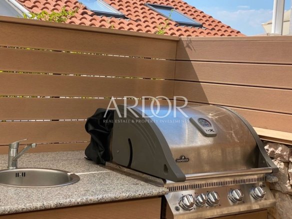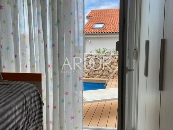 Ez a modern berendezésű és gondosan berendezett apartman két emeleten – alagsorban és földszinten – található. A 71 m²-es lakótérben előszoba, wc, tágas nappali, étkezős konyha és fedett terasz található az emeleten. Belső lépcső vezet az alagsorba, ahol van egy gyerekszoba, egy hálószoba saját fürdőszobával, egy további fürdőszoba, egy előszoba és egy kis tárolóhelyiség. Az alagsorból ki lehet jutni az udvarra, ahol fűtött medence, nyári konyha és pihenősarok található. A teraszon elektromosan működtetett napellenző van felszerelve, mely bármikor lehetővé teszi a kellemes időtöltést. A teraszról bájos kilátás nyílik a tengerre.