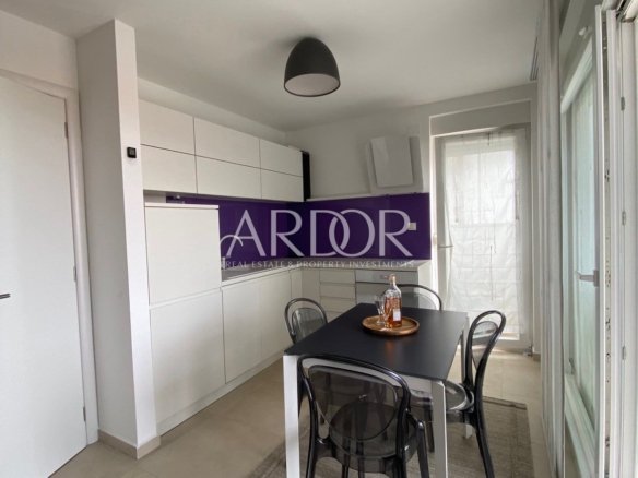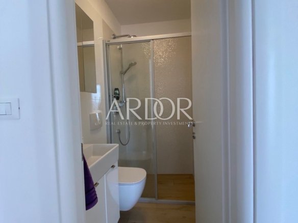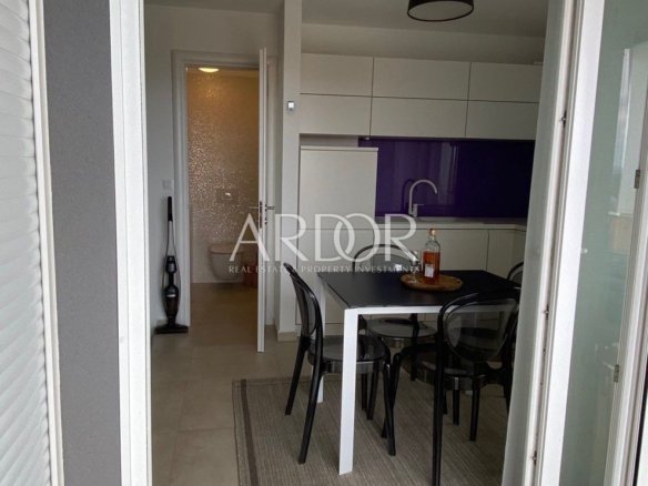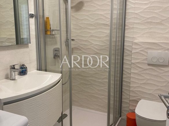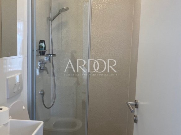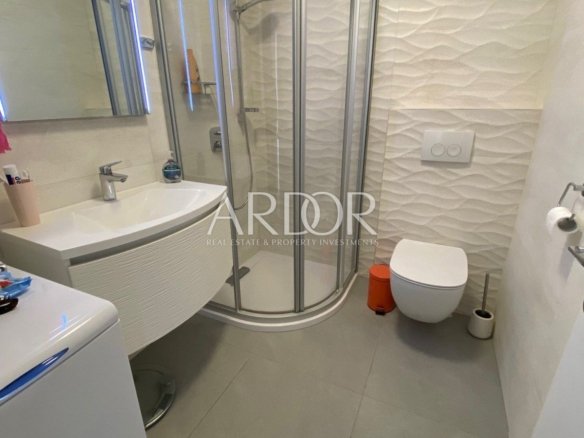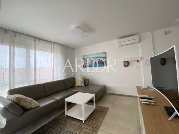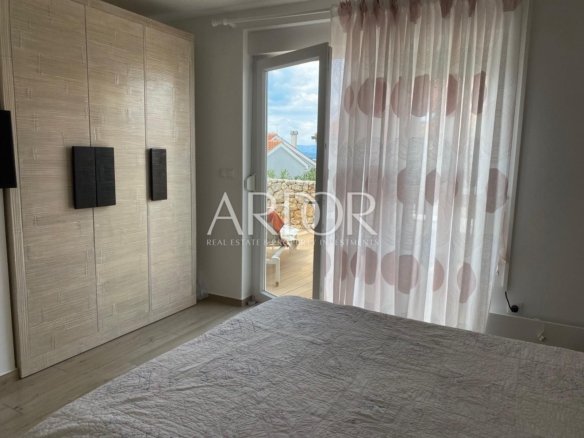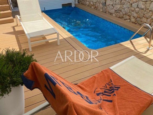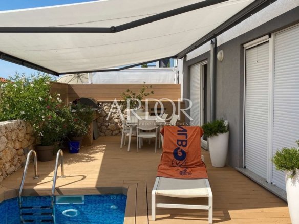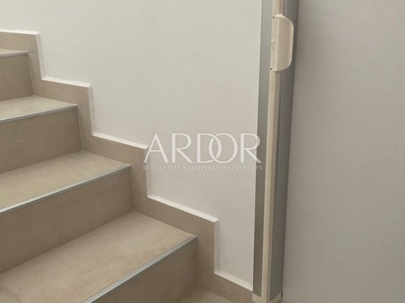 Ez a modern berendezésű és gondosan berendezett apartman két emeleten - alagsorban és földszinten - található. A 71 m²-es lakótérben előszoba, wc, tágas nappali, étkezős konyha, valamint az emeleten egy fedett terasz található. Belső lépcső vezet az alagsorba, ahol egy gyerekszoba, egy saját fürdőszobával rendelkező fő hálószoba, egy további fürdőszoba, egy előszoba és egy kis tároló található. Az alagsor különlegessége az udvar kijárata fűtött úszómedencével, nyári konyhával és pihenősarokkal. A teraszon elektromosan működtetett napellenző van felszerelve, amely mindenkor kellemes tartózkodást biztosít. A teraszról lenyűgöző kilátás nyílik a tengerre.
