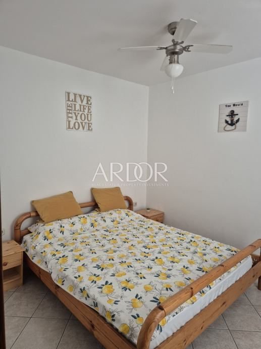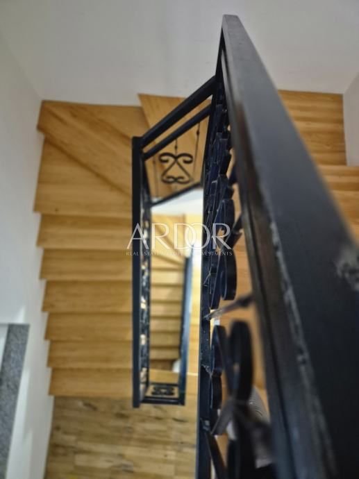 Nekretnina se proteže kroz tri etaže i zahvaljujući rasporedu pruža mogućnost odvajanja u tri zasebne stambene jedinice. U prizemlju se nalazi ulazno dvorište, kuhinja s blagovaonicom, dnevni boravak, kupaonica i ostava. Prvi kat sastoji se od dvije spavaće sobe, od kojih jedna ima izlaz na balkon, dnevnog boravka i kupaonice. Na drugom katu smješten je stan koji uključuje spavaću sobu, kuhinju s blagovaonicom i kupaonicu, a iz njega se izlazi na prostranu terasu od 30 m² s otvorenim pogledom na more. Kuća se prodaje potpuno namještena.
