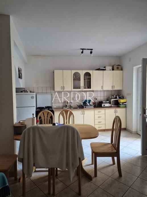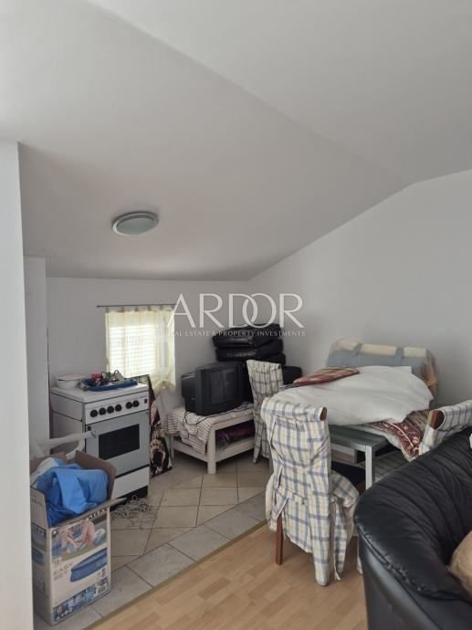The property extends over three floors and, thanks to its layout, offers the possibility of separation into three separate residential units. The ground floor has an entrance courtyard, kitchen with dining room, living room, bathroom and pantry. The first floor consists of two bedrooms, one of which has access to a balcony, living room and bathroom. On the second floor there is an apartment that includes a bedroom, a kitchen with a dining room and a bathroom, and from it there is an exit to a spacious 30 m² terrace with an open view of the sea. The house is being sold fully furnished.