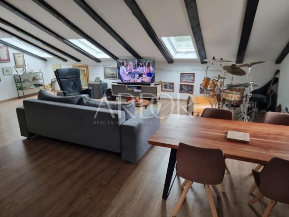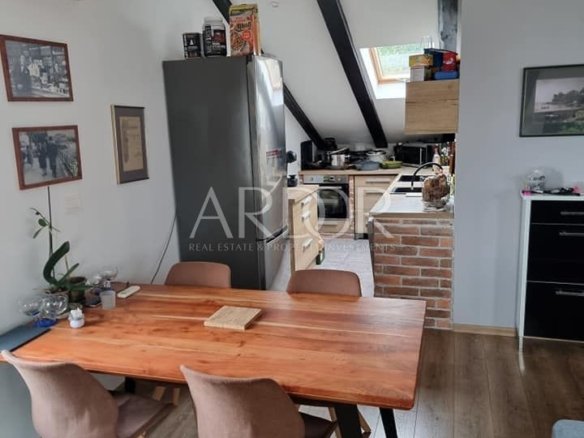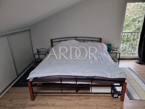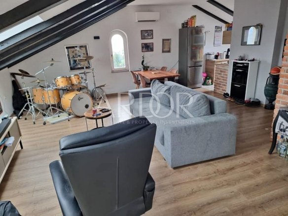 The building has two entrances, and due to the terrain configuration, the apartment is situated on the second floor from one side and on the fourth floor from the other. The apartment has a total floor area of 100 m², although it is officially registered as 70 m² due to attic regulations. It consists of a spacious living room that also serves as a dining area, a kitchen, one bedroom, a balcony, and includes one private parking space. Heating is provided via an air conditioning unit, with the option of wood heating.