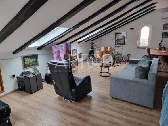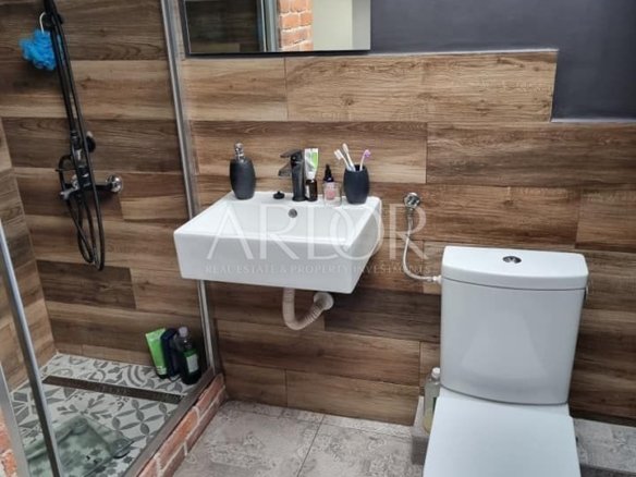 Das Gebäude hat zwei Eingänge – aufgrund der Geländekonfiguration liegt die Wohnung auf der einen Seite im zweiten, auf der anderen im vierten Stock. Die tatsächliche Fläche beträgt 100 m², jedoch ist die Wohnung aufgrund des Dachgeschosses in offiziellen Dokumenten mit 70 m² eingetragen. Sie besteht aus einem großzügigen Wohnzimmer mit Essbereich, Küche, einem Schlafzimmer, Balkon und einem privaten Parkplatz. Die Beheizung erfolgt über eine Klimaanlage, zusätzlich besteht die Möglichkeit, mit Holz zu heizen.