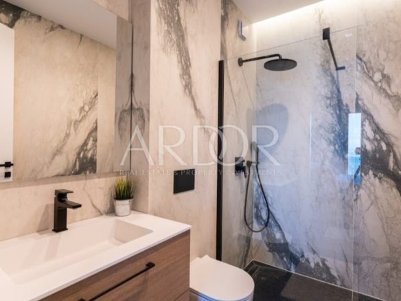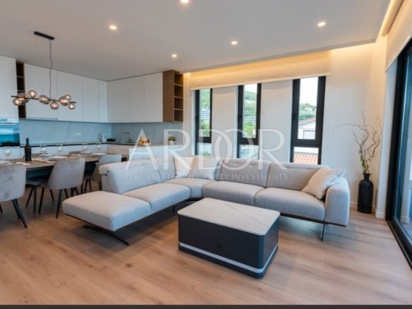 Vrhunski materijali korišteni u izgradnji nekretnine. Fasadna izolacija, zvučna izolacija, nadtemeljna izolacija (A+). Vanjska ALU stolarija s troslojnim staklom Schuco, ekstra visinom od 2,40m isto tako unutarnja protuprovalna vrata, brendirana keramika, parket. Grijanje/hlađenje na dizalicu topline a++. Kao dodatno grijanje instalirano je i podno etažno grijanje.