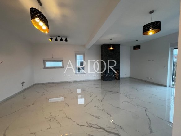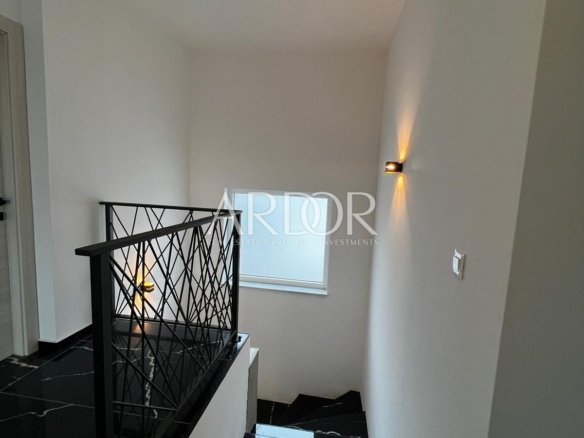 Interijer kuće promišljeno je osmišljen – prostrani dnevni boravak, blagovaonica i prostor predviđen za kuhinju čine otvorenu dnevnu zonu. Na katu se nalaze tri spavaće sobe, svaka s vlastitom modernom kupaonicom. Prizemlje dodatno obogaćuju sauna s tušem i odvojeni toalet.