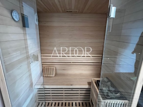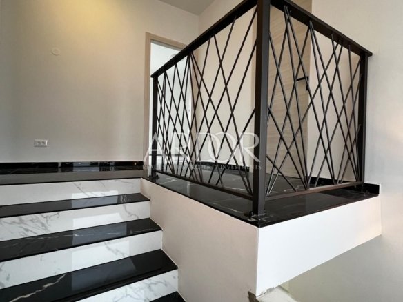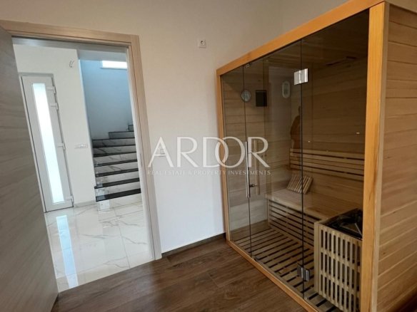 Ukupna stambena površina iznosi 162 m² raspoređenih na dvije etaže, uz dodatnih 27 m² terasa koje upotpunjuju osjećaj prostranosti i povezanosti s prirodom. U vanjskom dijelu nalazi se privatni bazen od 15 m² s protustrujnim plivanjem, savršen za opuštanje i rekreaciju.