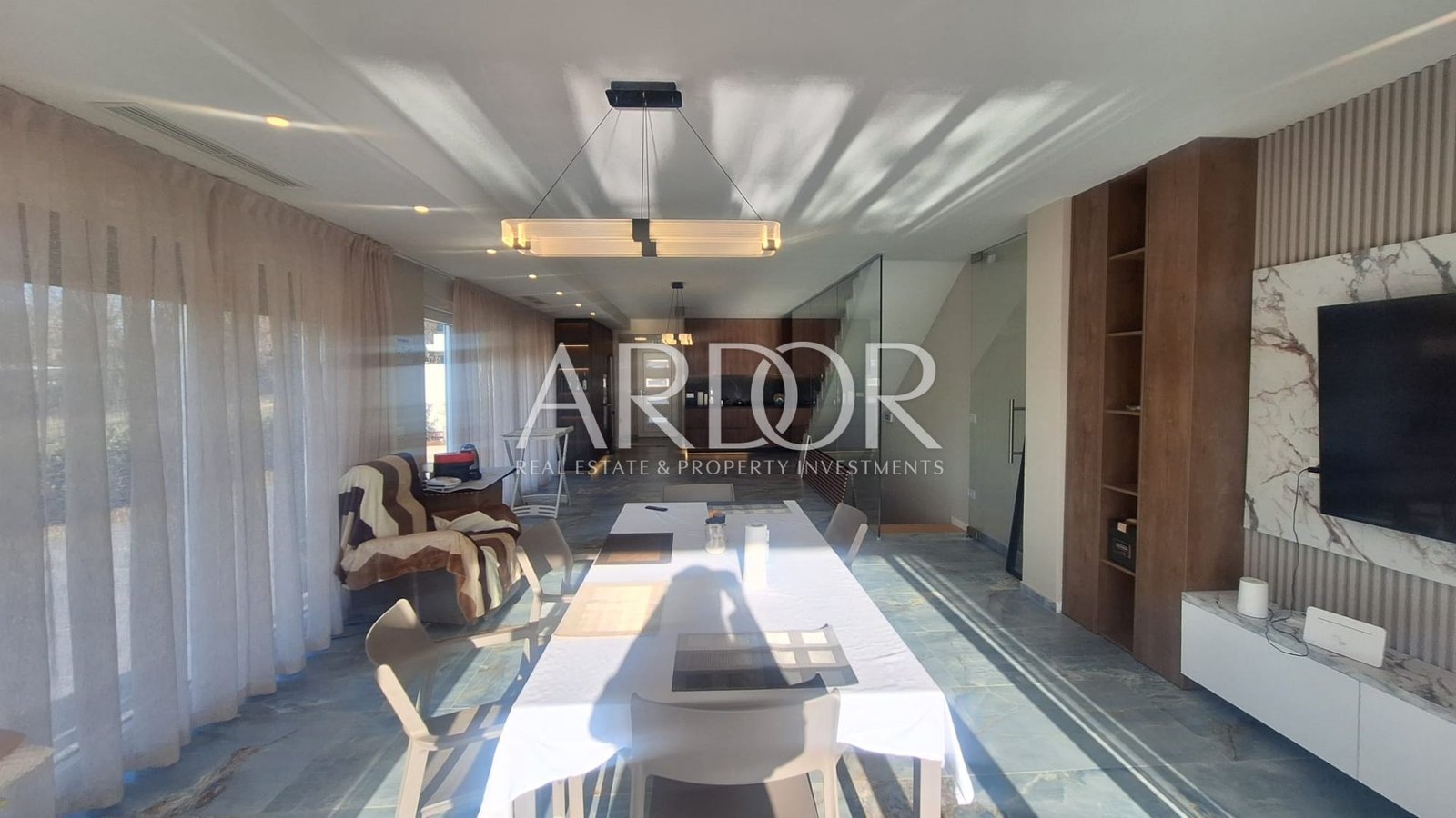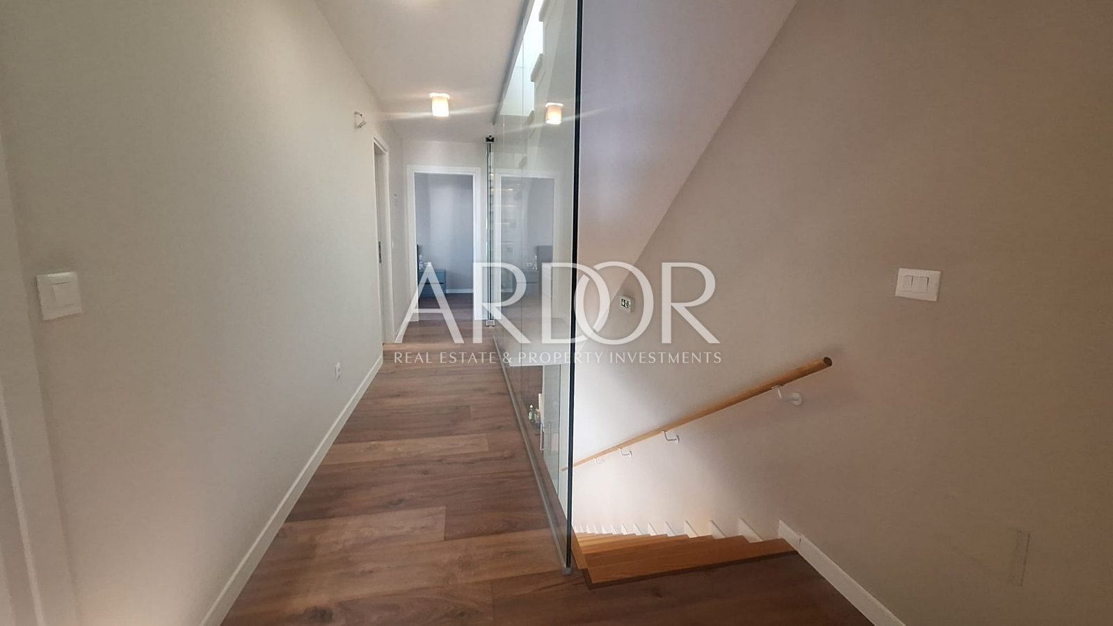 Kuća se prostire na tri etaže gdje se direktno od ulaza prilazi dnevnom boravku, kuhinji, kupatilu i izlazi u dvorište. Etaže su povezane spiralnim stepenicama te vode na gornji kat gdje se nalaze četiri sobe, kupatilo, wc te velika terasa s prekrasnim pogledom, a u prizemlje u kino sobu, spa zonu i svojevrsnu ostavu.
