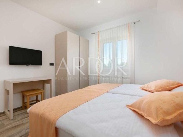 A 2019-ben teljesen felújított kisebb kőépületben nappali, konyha étkezővel, fürdőszoba és egy szoba saját fürdőszobával. A második emeleten két hálószoba, fürdőszoba és konyha található. Teljesen légkondicionált, központi fűtése gáz- és napkollektoros.