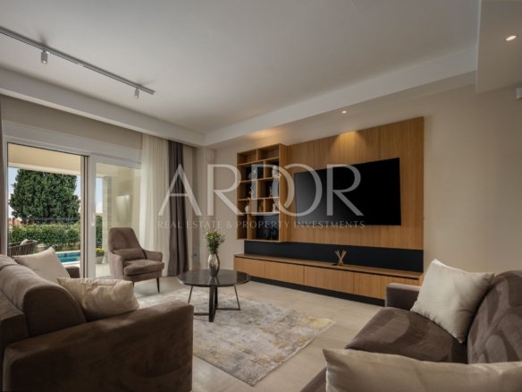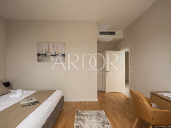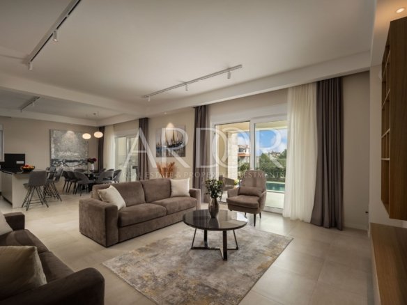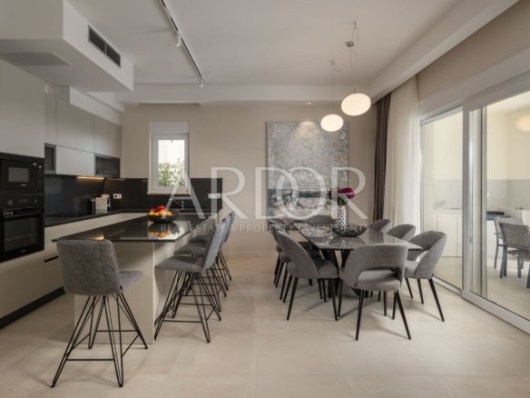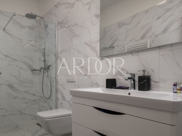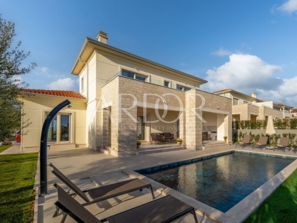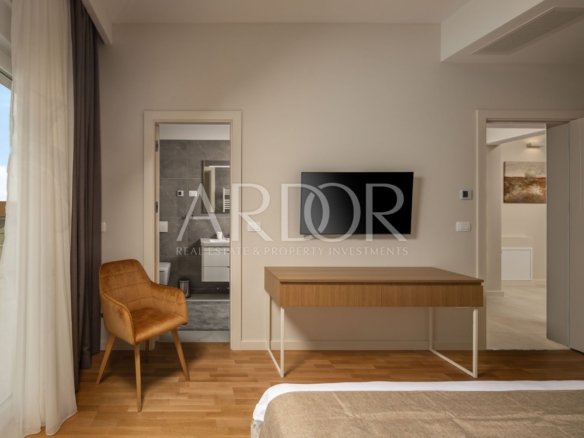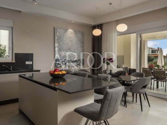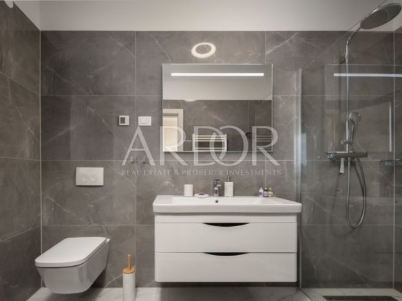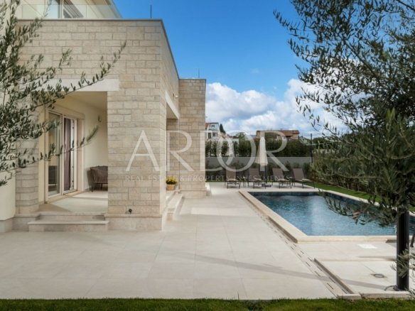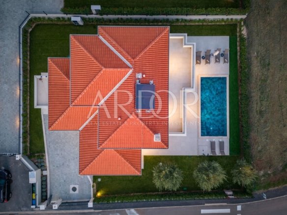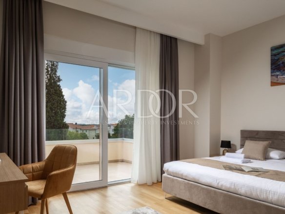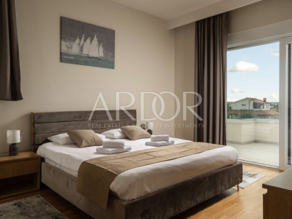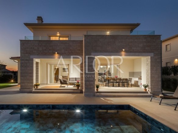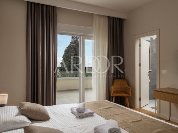 Im ersten Stock befinden sich zwei weitere Schlafzimmer mit jeweils eigenem Bad und WC sowie Ausgang zur Terrasse mit Panoramablick auf das Meer (Richtung Poreč und Novigrad). Auf dem Grundstück befinden sich zwei Parkplätze. Schwimmbad von 30 m2, beheizt. Es verfügt über eine automatische Bewässerung, einen Alarm und ein Videosystem.
