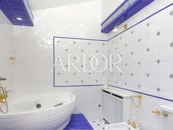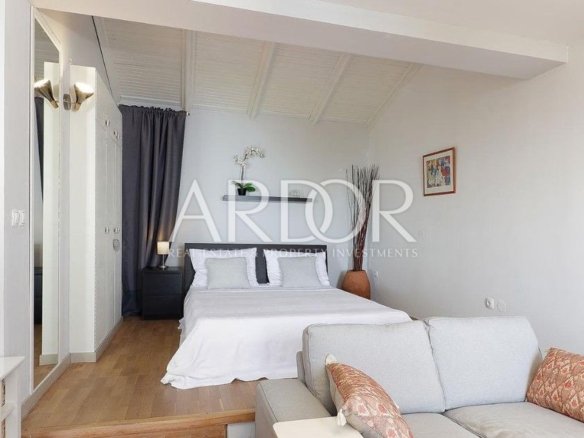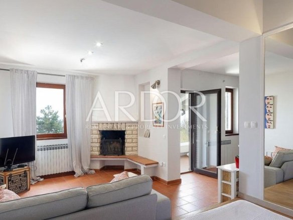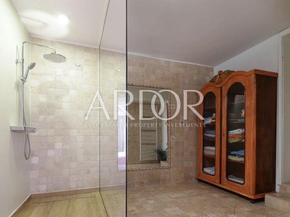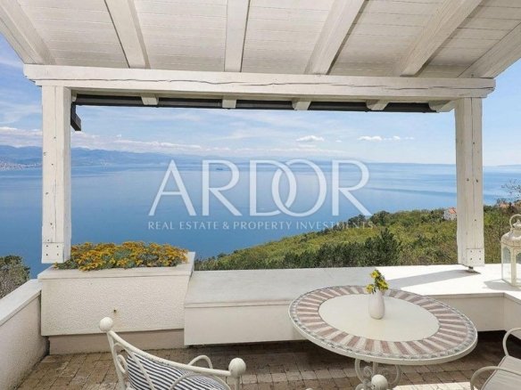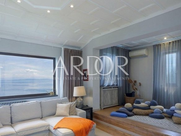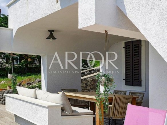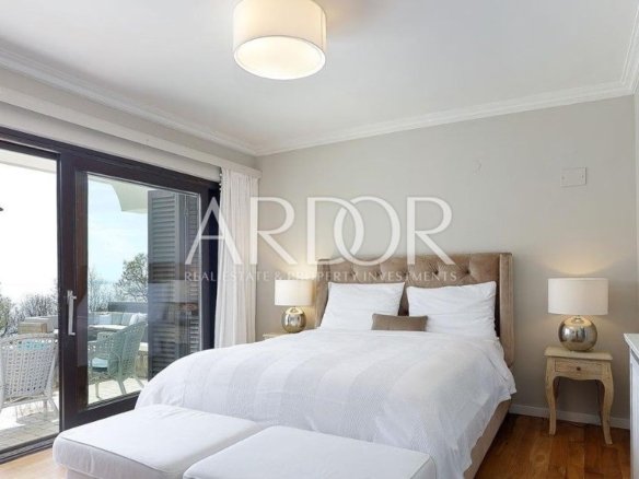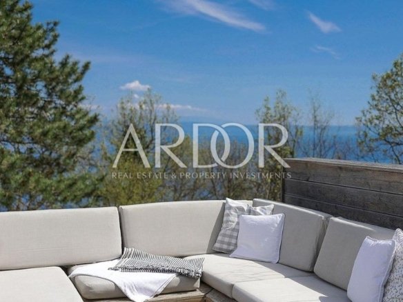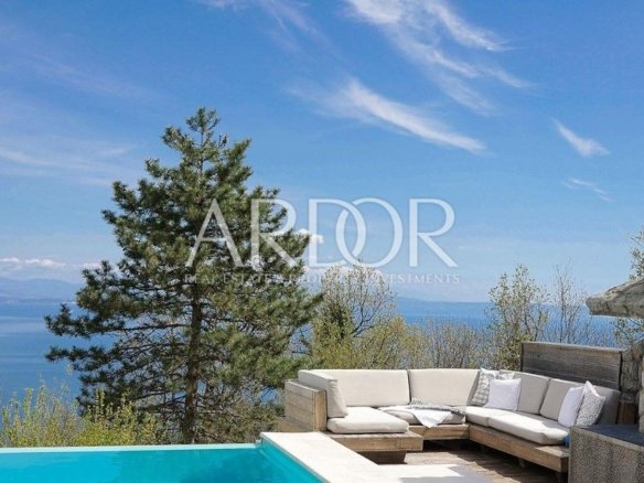 L’incantevole soggiorno principale è collegato all’ampia sala da pranzo e alla cucina, mentre l’intero spazio gode di una vista libera sul Golfo del Quarnero; dalla sala da pranzo si accede a un grazioso balcone con vista mozzafiato. Dalla cucina, splendidamente arredata e completamente attrezzata, si accede alla terrazza con piscina. Inoltre, è presente un altro soggiorno con cucina e sala da pranzo, che garantisce funzionalità e praticità nella vita di tutti i giorni.