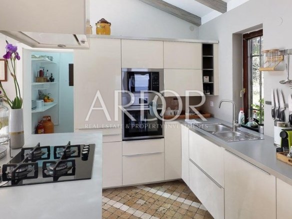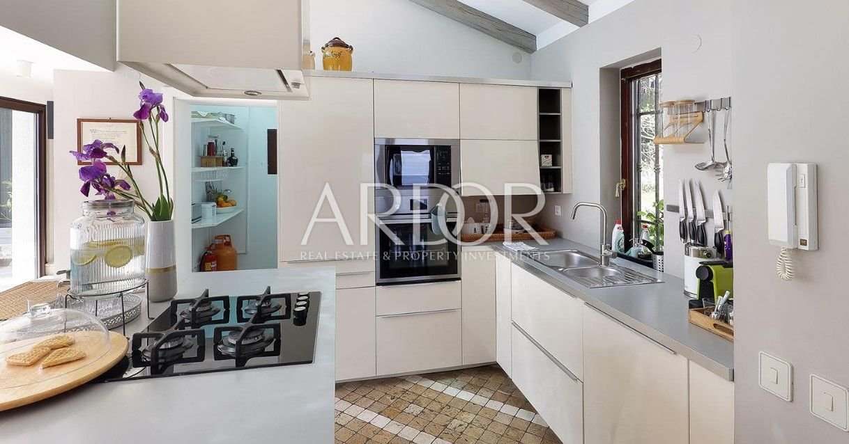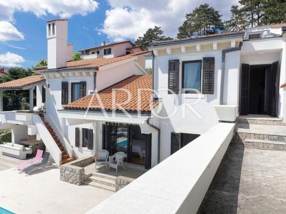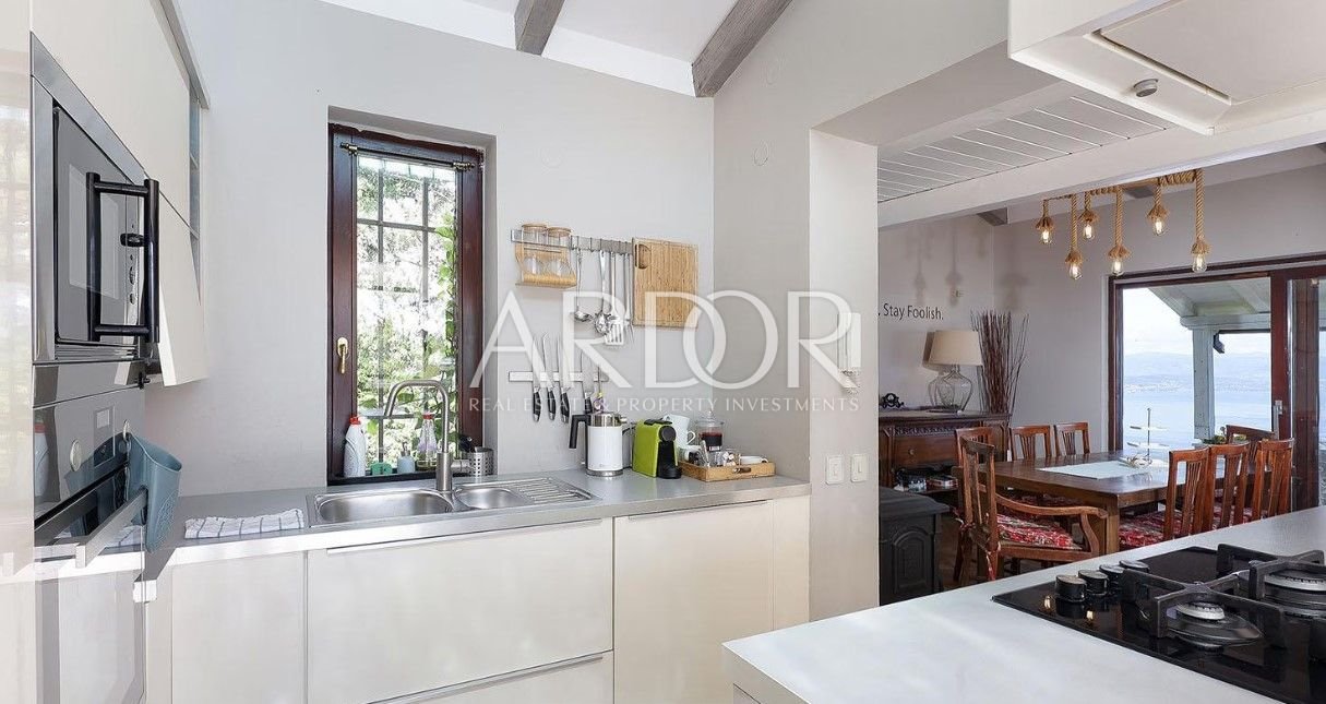 The beautiful main living room is connected to the spacious dining room and kitchen, while the entire space has an unobstructed view of the Kvarner Bay, and from the dining room you can exit to a charming balcony where the view is breathtaking. From the beautifully decorated and fully equipped kitchen you can exit to the terrace with a swimming pool. In addition to this, there is another living room with a kitchen and dining room, which ensures functionality and convenience in everyday life.