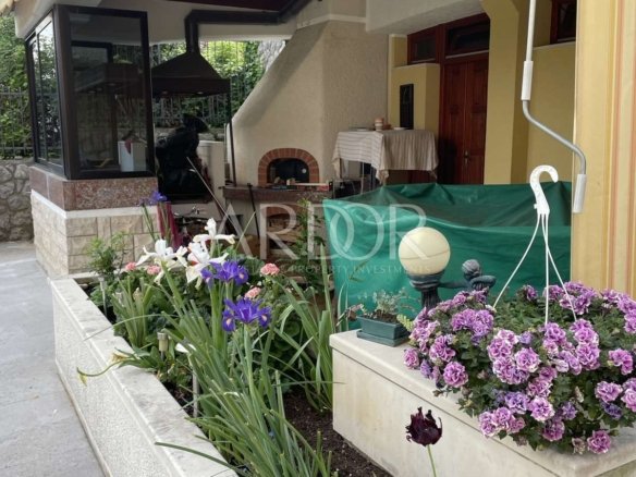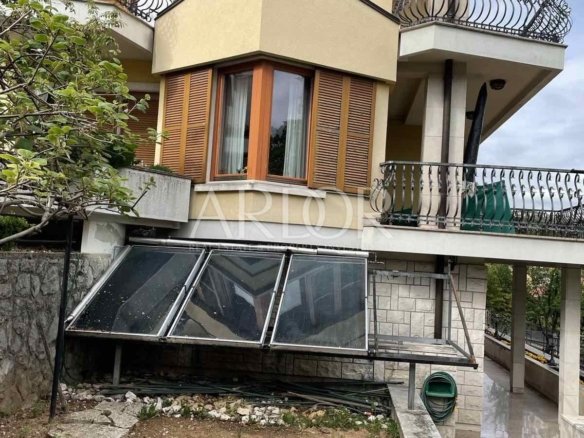 Volosko, in the old coastal village, a detached house for sale near the sea with a total area of 350 m2 which consists of a basement, ground floor and first floor. In the basement, of approximately 80 m2, there is a social room, small kitchen and one bedroom and guest toilet. On the same floor there is a SPA area with a relaxing hot tub with shower and sauna. On the south side there is a large terrace for socializing that stretches the entire length of the house. The ground floor consists of a living room that has a separate exit to the terrace, kitchen with terrace, dining room, laundry room, hallway and bathroom and another separate toilet. The first floor is adorned with a large bathroom, one separate toilet and dressing room and 4 bedrooms with terraces with beautiful sea views. On a landscaped garden of 950 m2 there is parking for 3 vehicles and a garage where 2 cars can be parked. Heating is central heating oil and there are solar panels on the roof of the house. The house is well insulated with 50 cm thick walls.