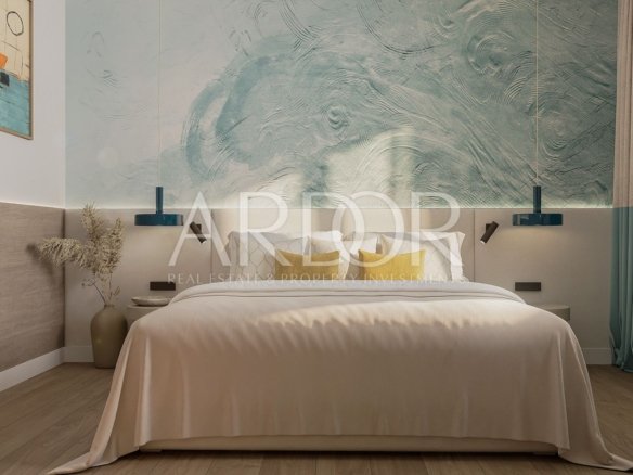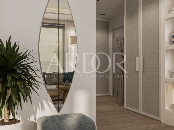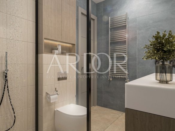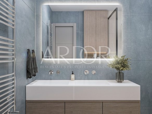 The apartments are equipped with heating and cooling systems with Daikin heat pumps, a fan coil system, all have underfloor heating, three-layer aluminum joinery with glass walls up to 7.5m wide. There are first-class parquet floors on the floors, and the bathrooms are equipped with high-quality Italian ceramics.