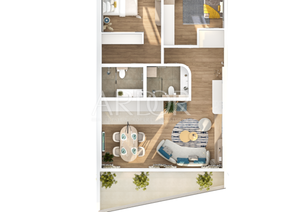 Non appena si entra nell'edificio, si rimane affascinati dal design moderno e dai materiali accuratamente selezionati, che trasmettono una sensazione di eleganza e lusso. Ogni appartamento è orientato da sud a nord, sul lato sud c'è un balcone, mentre gli appartamenti laterali sono orientati su tre lati, con terrazze più grandi e aperte.