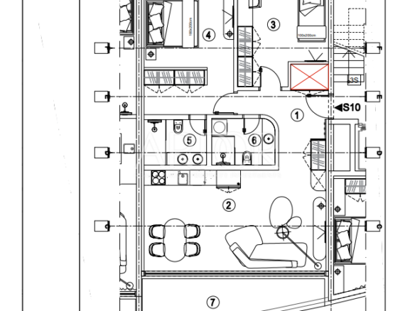 Prvo nadstropje, stanovanje S10, skupne površine 88,84 m2. Sestavljen je iz predsobe (8,42m2), odprtega koncepta kuhinje, jedilnice in dnevne sobe (28,74m2) iz katere je izhod na 10,33m2 velik balkon s čudovitim pogledom na morje, dveh spalnic od tega 1. večja (19,12m2) z lastno kopalnico (4,72m2), manjša soba (112,65m2) in kopalnica (4,86m2).