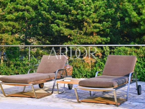 The main house includes two bedrooms, a spacious living room with a fireplace, a modern fully equipped kitchen, and a bathroom. From the living area, there is access to a large partially covered terrace (100 m²) surrounded by greenery, next to an infinity pool (10 x 4 m) with open sea views. Underfloor heating throughout the entire space, additional air conditioning, and southern orientation ensure year-round comfort.