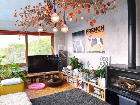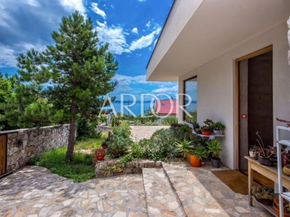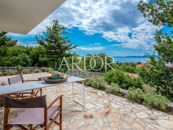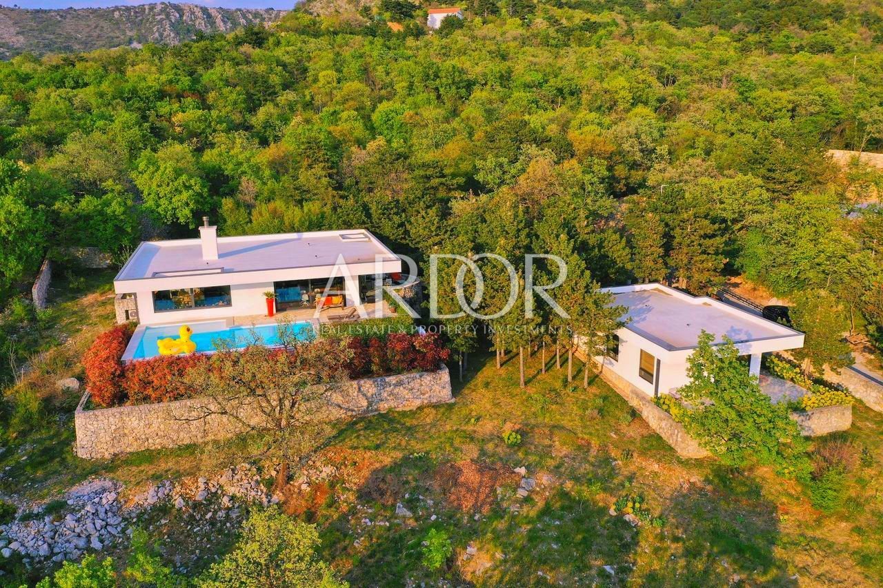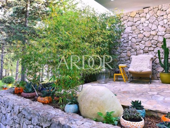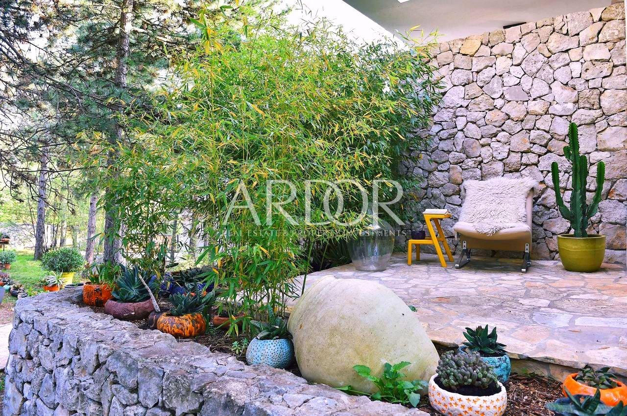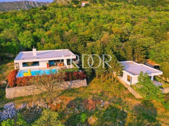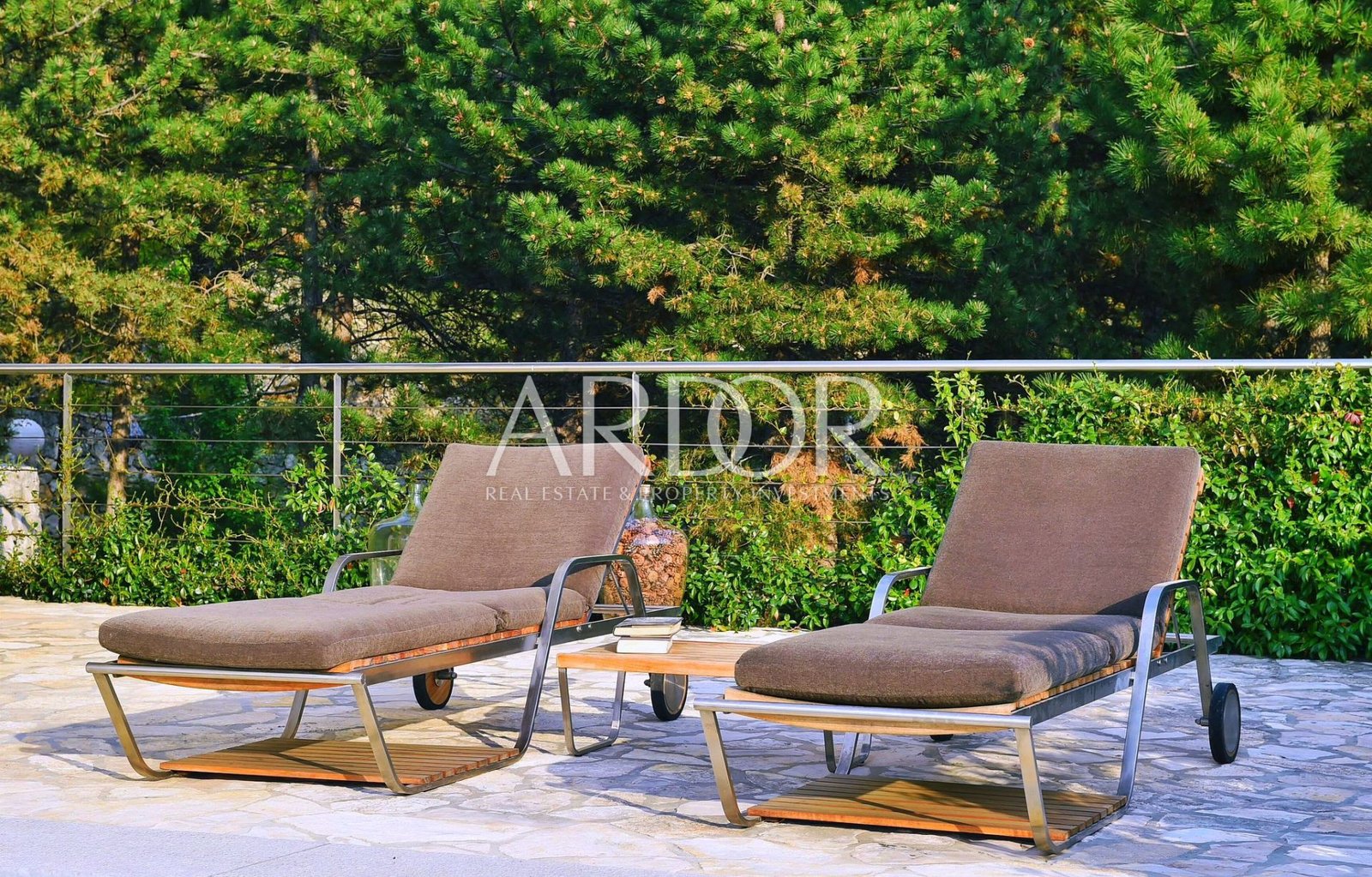 Glavna kuća obuhvaća dvije spavaće sobe, prostrani dnevni boravak s kaminom, moderno uređenu kuhinju i kupaonicu. Iz dnevnog dijela izlazi se na veliku djelomično natkrivenu terasu od 100 m² koja je oplemenjena zelenilom, uz koju se nalazi infinity bazen (10 x 4 m) s otvorenim pogledom na more. Podno grijanje u cijelom prostoru, dodatno klimatizirano te južna orijentacija osiguravaju udobnost kroz cijelu godinu. Gostinjska kuća ima vlastiti ulaz i terasu, čime dodatno pridonosi privatnosti i funkcionalnosti cijelog kompleksa.