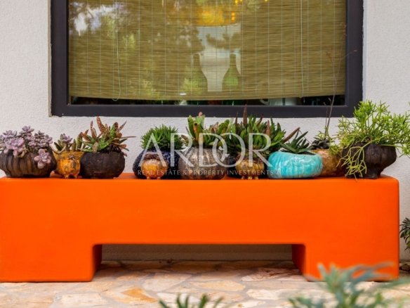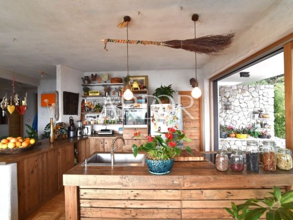 Glavna hiša vključuje dve spalnici, prostoren dnevni prostor s kaminom, moderno kuhinjo in kopalnico. Iz dnevnega prostora je izhod na delno pokrito teraso (100 m²), obdano z zelenjem, poleg katere je infinity bazen (10 x 4 m) z odprt pogledom na morje.