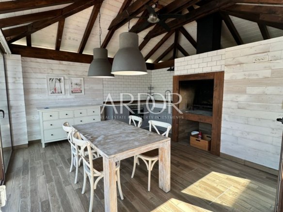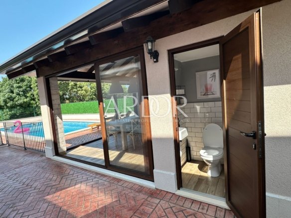 Na prostranoj i lijepo uređenoj okućnici nalazi se bazen s pripadajućom vrtnom kućicom koja služi kao potpuno opremljena ljetna kuhinja, s kaminom, manjim WC-om i dodatnim spremištem. Iza kuće je privatno sportsko igralište, a dodatnu vrijednost pruža konoba u suterenu – idealna za vinski podrum ili prostor za druženje.