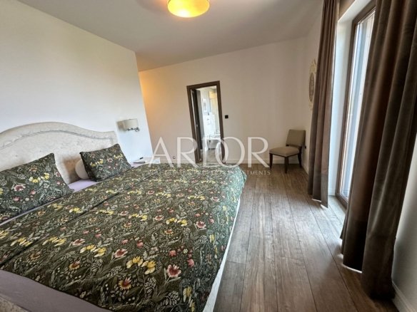 V zgornjem nadstropju sta dve udobni spalnici, ki si delita kopalnico z banjo, medtem ko ima glavna spalnica garderobno sobo in lastno kopalnico s tušem. Vse sobe imajo izhod na zasebne balkone s pogledom na morje in zelenje.