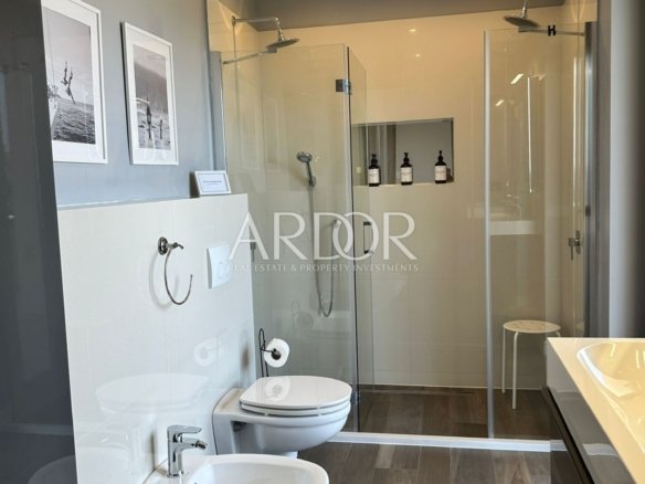 Al piano superiore ci sono due camere da letto che condividono un bagno con vasca, mentre la camera matrimoniale dispone di cabina armadio e bagno privato con doccia. Tutte le camere hanno accesso ai balconi privati con vista sul mare e sul verde circostante.