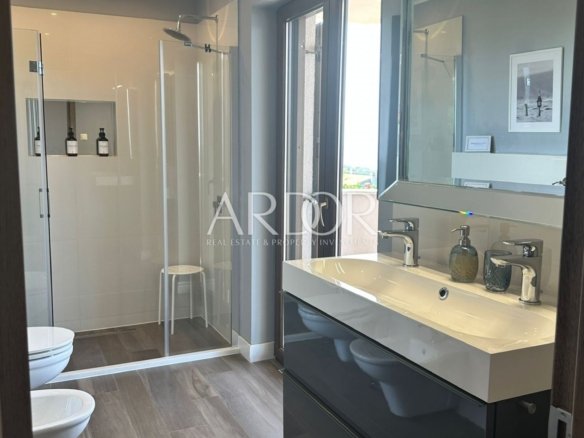 Na katu su smještene dvije udobne spavaće sobe koje dijele kupaonicu s kadom, dok glavna spavaća soba uključuje walk-in ormar i vlastitu kupaonicu s tušem. Sve sobe imaju izlaz na privatne balkone s pogledom na more i okolno zelenilo.
