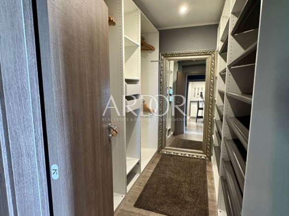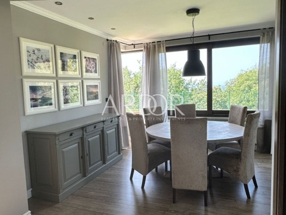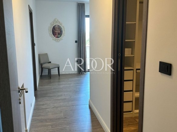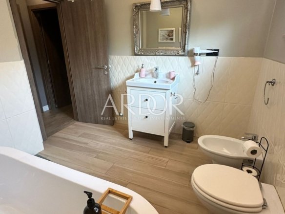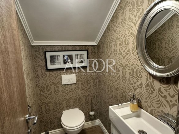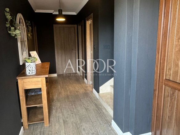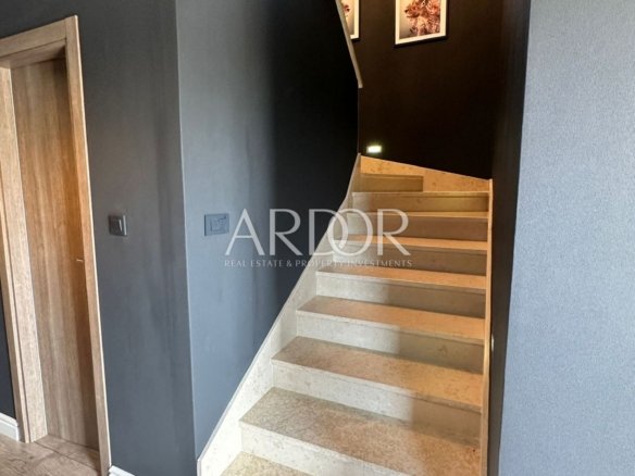 La casa si sviluppa su due piani per una superficie abitabile totale di 250 m², su un terreno paesaggistico di 1036 m². Al piano terra troviamo un luminoso soggiorno, cucina moderna completamente attrezzata, sala da pranzo separata, dispensa, toilette per gli ospiti e una stanza aggiuntiva o ufficio con ingresso indipendente – ideale come studio o alloggio per ospiti. Ci sono anche lavanderia, locale caldaia con deposito e garage chiuso.