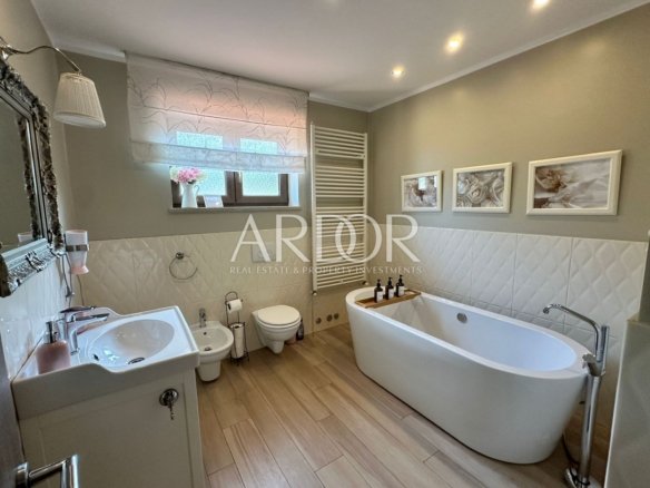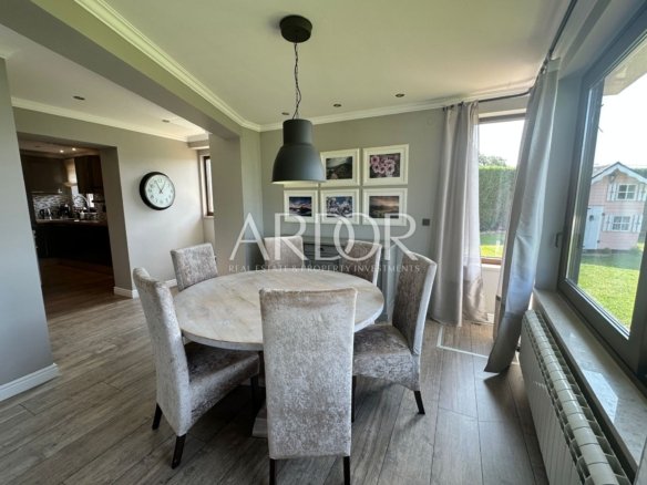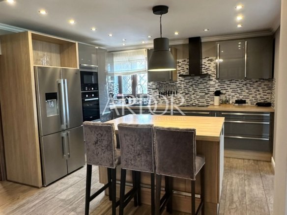 The house spans two floors with a total living area of 250 m², set on a beautifully landscaped plot of 1036 m². The ground floor features an airy living room, a modern fully equipped kitchen, a separate dining room, pantry, guest toilet, and an additional room or office with a separate entrance – ideal for a home office or guest suite. Also on the ground floor are a laundry room, boiler room with storage, and a closed garage.