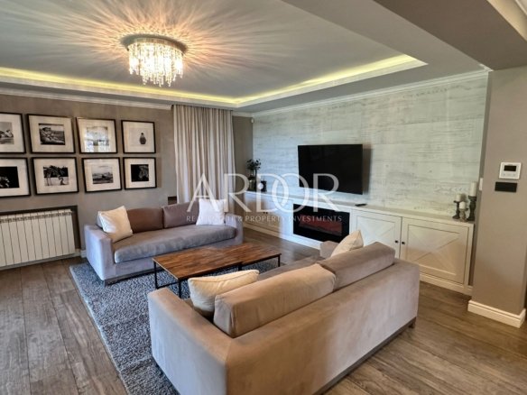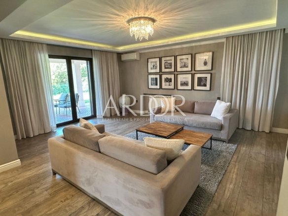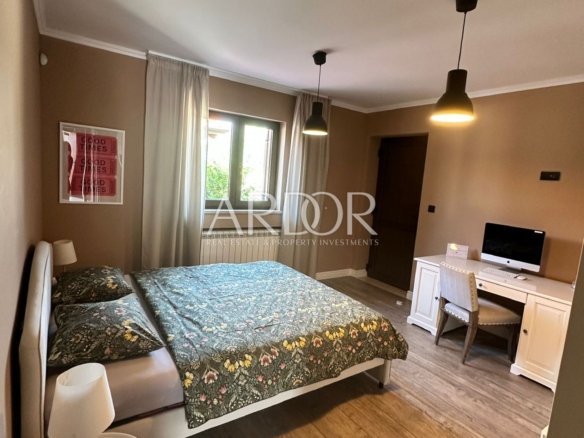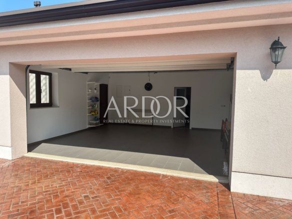 Kuća se prostire na dvije etaže, ukupne stambene površine 250 m², s njegovanom okućnicom od 1036 m². Prizemlje obuhvaća prozračan dnevni boravak, moderno opremljenu kuhinju, odvojenu blagovaonicu, ostavu, toalet za goste te dodatnu sobu ili ured sa zasebnim ulazom iz dvorišta – idealno za kućni ured ili gostinjski prostor. U prizemlju se također nalaze funkcionalna sušiona, kotlovnica sa spremištem te zatvorena garaža.