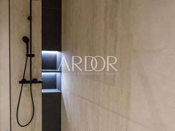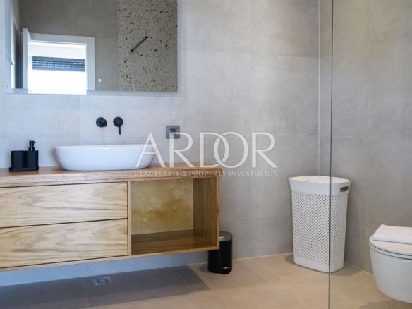 Unutrašnjost vile raspoređena je na dvije etaže i pažljivo osmišljena kako bi pružila maksimalnu udobnost i funkcionalnost. Dodatnih 121 m² terasa te vanjski bazen površine 32 m² skladno nadopunjuju unutarnji prostor, brišući granicu između interijera i eksterijera.