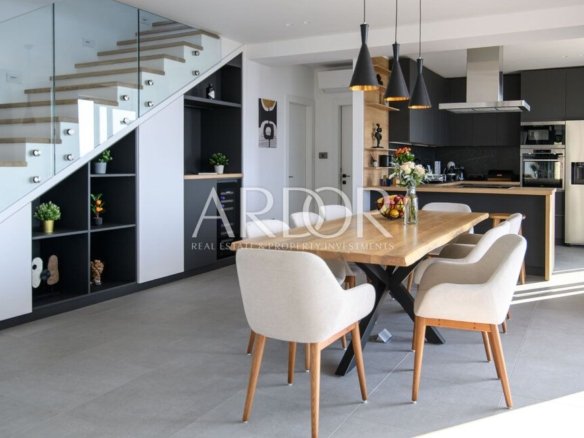 Otvoreni koncept dnevnog boravka, kuhinje i blagovaonice stvara dojam prostranosti, dok velike staklene stijene omogućuju neprekinut pogled na more i izravan izlaz na terasu. Interijer odiše toplinom doma, uz pažljivo birane materijale i detalje koji podižu razinu estetike i udobnosti. U prizemlju se nalazi i dodatni toalet, tehnička soba te praktičan prostor za pohranu.