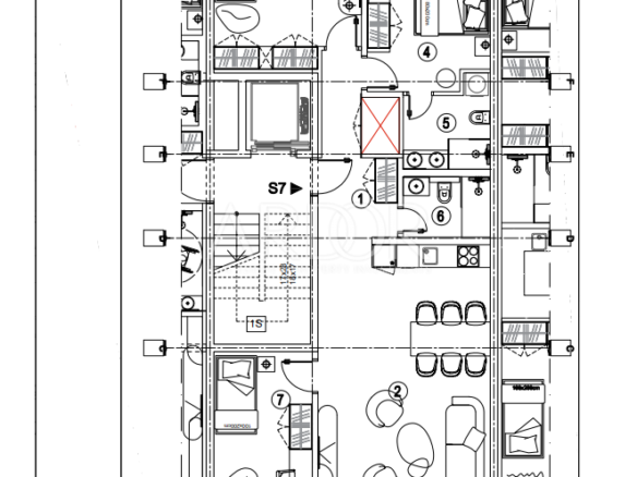 Prvo nadstropje, stanovanje S7, skupne površine 105,30 m2. Sestavljeno je iz predsobe (9,37m2), odprtega koncepta kuhinje, jedilnice in dnevne sobe (29,30m2) iz katere se izstopa na 16,17m2 velik balkon s čudovitim pogledom na morje, treh spalnic od tega ena večja (15,08m2). m2) z lastno kopalnico (6,02m2), dvema manjšima sobama (14,46 in 11,19m2) in kopalnico (3,71m2).