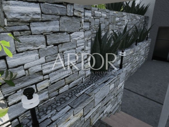 Okućnica površine 274,27 m² uključuje grijani bazen od 24 m² s protustrujnim plivanjem, tri parkirna mjesta – jedno s vlastitom punionicom za električna vozila, dok su preostala dva natkrivena.