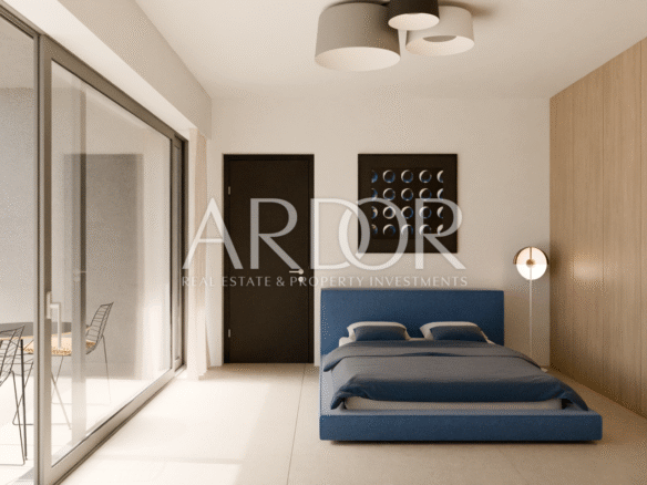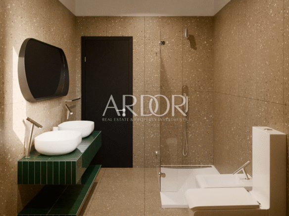 Svaki dvoetažni stan prostire se na 139 m² interijera i odlikuje ga moderan, prozračan raspored. U prizemlju se nalazi prostrani dnevni boravak s velikim staklenim stijenkama koje otvaraju prostor prema vanjskom dijelu s loggiom, sunčalištem i privatnim grijanim bazenom površine 40 m². Dnevna zona povezana je s kuhinjom i blagovaonicom, a dodatnu vrijednost pružaju spavaća soba s vlastitom kupaonicom, vešeraj i wellness prostorija sa saunom i tušem.
