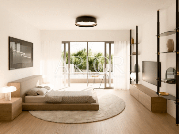 Ogni appartamento duplex occupa 139 m² di spazio interno e presenta una disposizione moderna e ariosa. Al piano terra si trova un ampio soggiorno con grandi vetrate che si aprono sulla zona esterna con loggia, solarium e piscina privata riscaldata di 40 m². La zona giorno è collegata alla cucina e alla sala da pranzo, e un valore aggiunto è dato dalla presenza di una camera da letto con bagno privato, una lavanderia e una sala benessere con sauna e doccia.