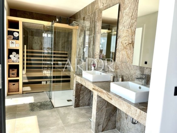 The master bedroom on this floor is a true oasis of luxury, with its own bathtub, modern Scandinavian sauna in the bathroom and a large terrace with a mesmerizing view of the sea. There is also a spacious walk-in closet.