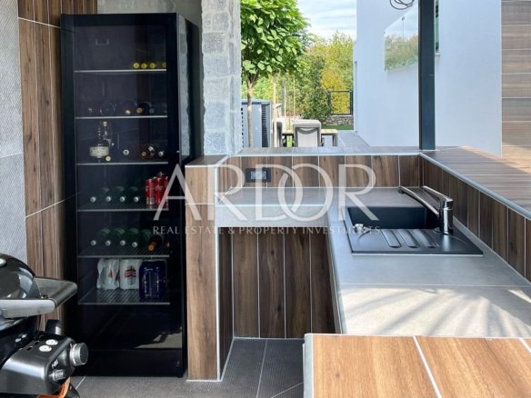 The villa’s outdoor space is specially designed for outdoor enjoyment with a 34 m² infinity pool overlooking the sea, while a sundeck with poolside loungers allows you to enjoy sunny days. A summer kitchen with barbecue is ideal for preparing meals outdoors, and an outdoor dining table allows you to enjoy meals in the fresh air.