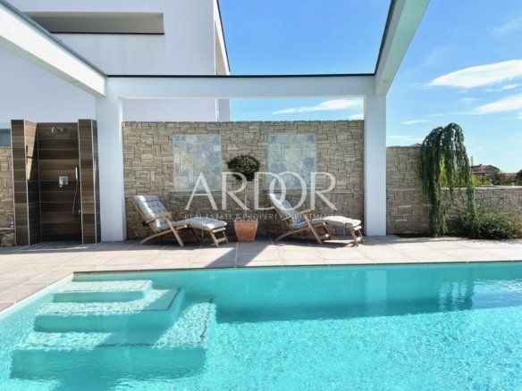 Diese moderne Villa mit Pool liegt auf der Insel Krk und bietet einen bezaubernden Blick auf das Meer und die Insel Cres und bietet die perfekte Mischung aus Komfort und Privatsphäre.