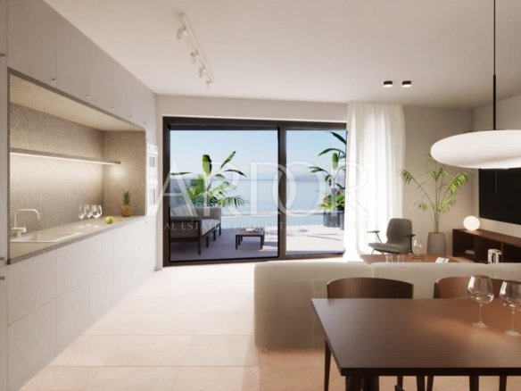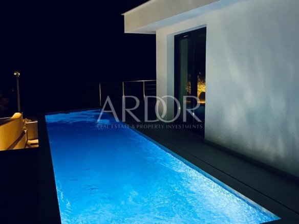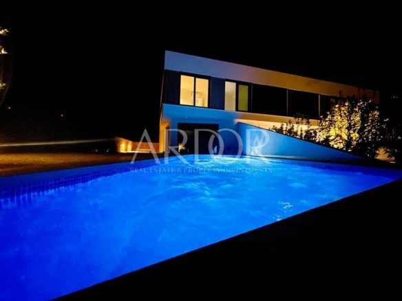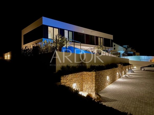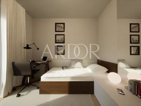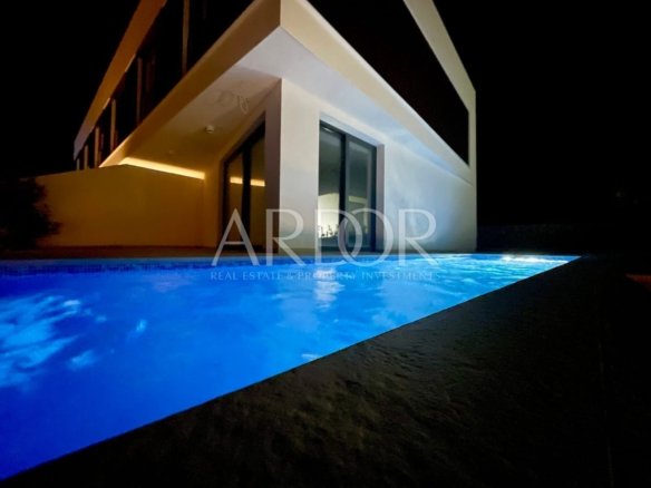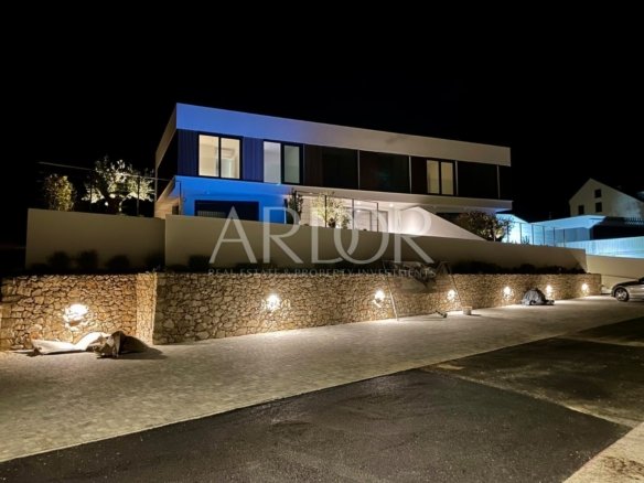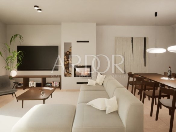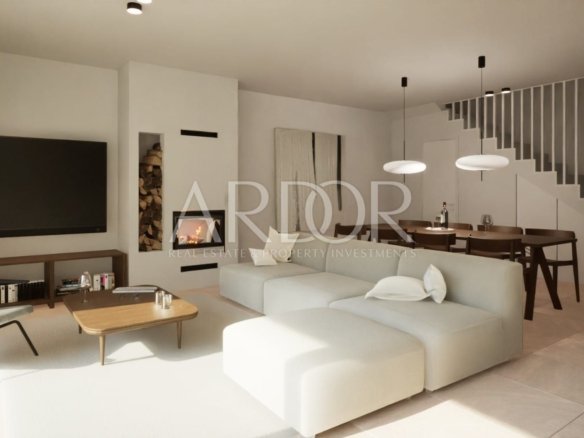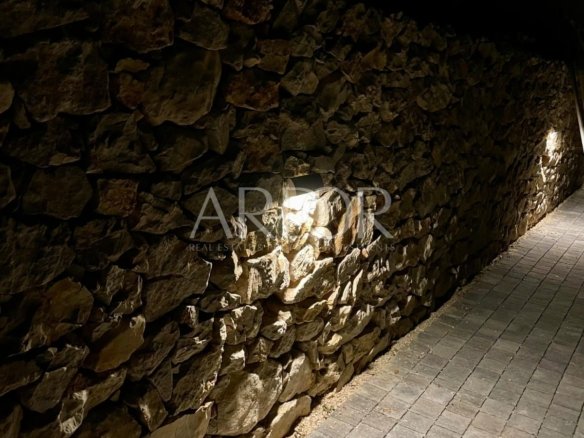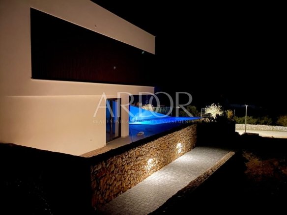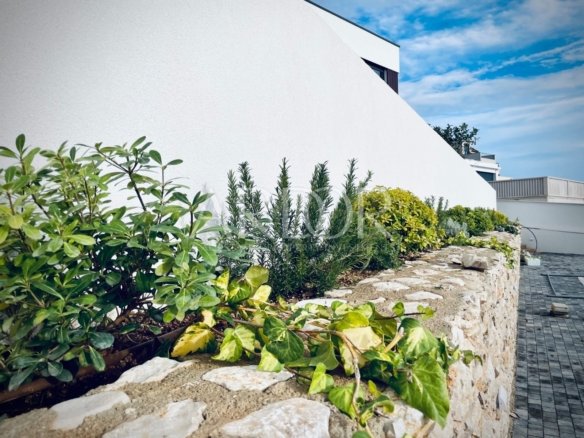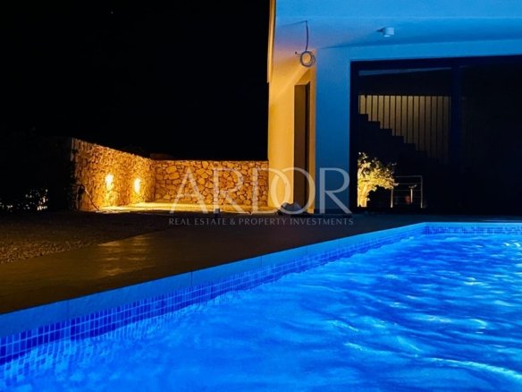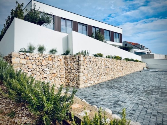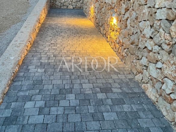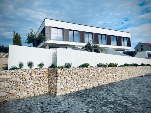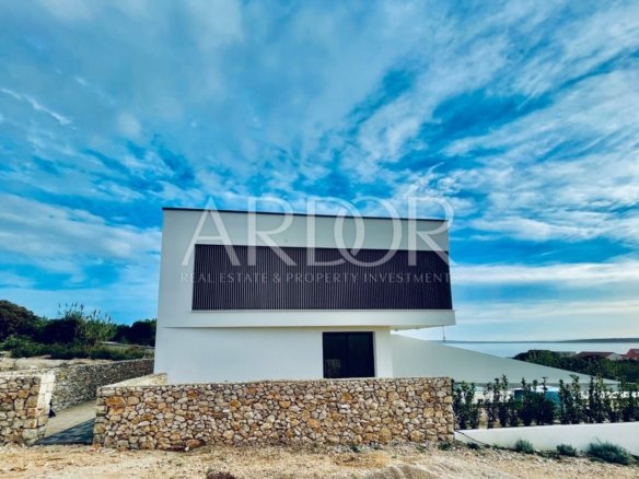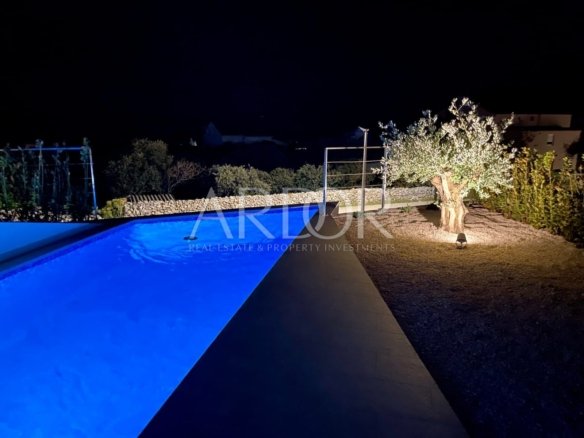 The island of Pag, Mandre, we mediate the sale of a newly built apartment consisting of the ground floor and the first floor. The size of the apartment is 130 m2. The property is located in a small and quiet settlement on the south side of the island, Mandre, facing Silba and Olib and the islets of Maun and Škrda, which are full of coves and beautiful beaches. On the ground floor of the apartment there is a kitchen, dining room, living room and toilet. Also, there is a large glass wall with an exit to the covered terrace where there is a swimming pool, surrounded by a sunbathing area and a beautiful lawn, and an old olive tree contributes to the beauty of the environment. On the first floor, there are 3 bedrooms, two of which have a view of the sea and their own bathrooms, while the third room has a view to the north. The apartment has two parking spaces and a 100 m2 garden. The interior is very luxuriously decorated with Marazzi 60×120 tiles, Hans Grohe faucets, electric blinds and blinds, mosquito nets… completion of construction is expected by the end of 2023.