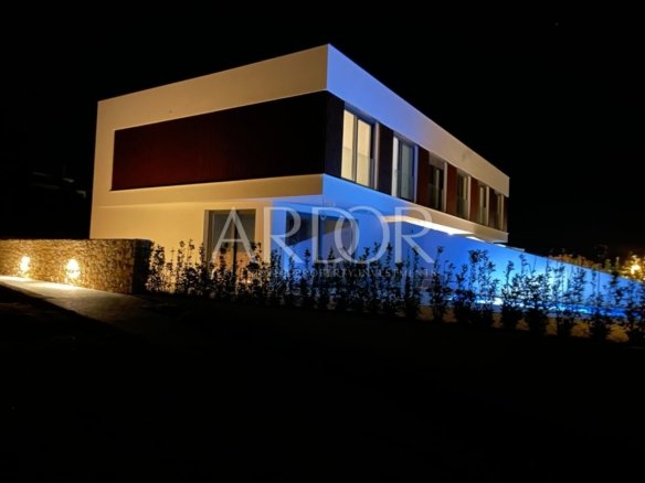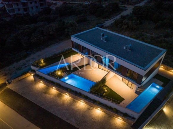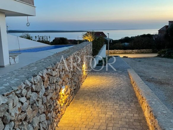 Otok Pag, Mandre posredujemo u prodaji novoizgrađenog stana i koji se sastoji od prizemlja i prvoga kata. Veličina stana je 130 m2 Nekretnina je smještena u malom i mirnom naselju na južnoj strani otoka, Mandre, okrenute na Silbu i Olib te na otočiće Maun i Škrdu, koji obiluju uvalama i prekrasnim plažama. U prizemlju stana nalazi se kuhinja, blagovaonica, dnevni boravak i WC. Također, tu se nalazi velika staklena stijena sa izlazom na natkrivenu terasu na kojoj se nalazi bazen, okružen sunčalištem i lijepim travnjakom, a ljepoti ambijenta pridonosi i stara maslina. Na prvome katu nalaze se 3 spavaće sobe, i to dvije sobe sa pogledom na more i vlastitim kupaonicama, dok je treća soba sa pogledom na sjever. Stan ima dva pripadajuća parkirna mjesta i 100 m2 okućnice. Interijer je jako luksuzno uređen sa pločicama Marazzi 60×120, slavine Hans grohe, sjenila i rolete na struju, komarnici…